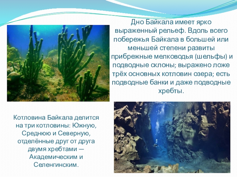 Слайд 13Дно Байкала имеет ярко выраженный рельеф. Вдоль всего побережья Байкала в