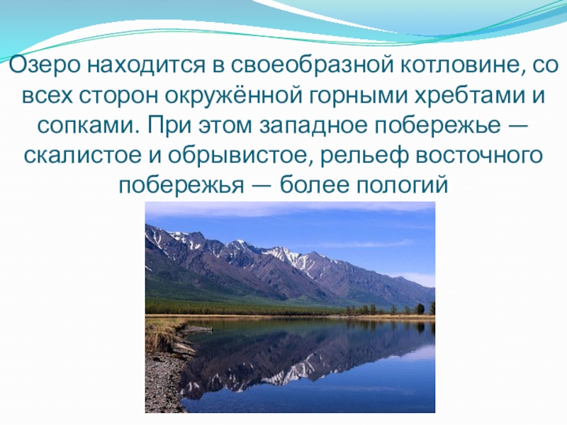Слайд 5Озеро находится в своеобразной котловине, со всех сторон окружённой горными хребтами