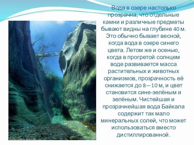 бывают видны на глубине 40 м. Это обычно бывает весной, когда вода в озере синего цвета. Летом же и осенью, когда в прогретой солнцем воде развивается масса растительных и животных организмов, прозрачность её снижается до 8—10 м, и цвет становится сине-зелёным и зелёным. Чистейшая и прозрачнейшая вода Байкала содержит так мало минеральных солей, что может использоваться вместо дистиллированной.