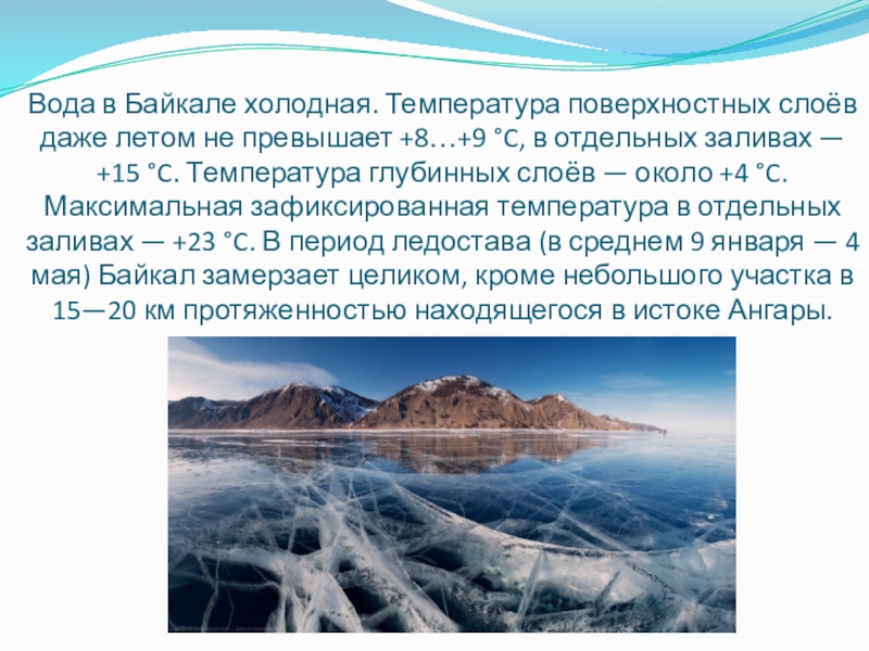 Слайд 12Вода в Байкале холодная. Температура поверхностных слоёв даже летом не превышает