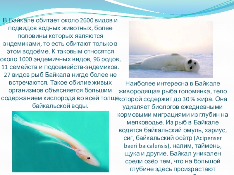 половины которых являются эндемиками, то есть обитают только в этом водоёме. К таковым относятся около 1000 эндемичных видов, 96 родов, 11 семейств и подсемейств-эндемиков. 27 видов рыб Байкала нигде более не встречаются. Такое обилие живых организмов объясняется большим содержанием кислорода во всей толще байкальской воды.