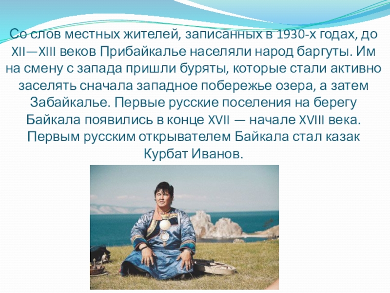 Прибайкалье населяли народ баргуты. Им на смену с запада пришли буряты, которые стали активно заселять сначала западное побережье озера, а затем Забайкалье. Первые русские поселения на берегу Байкала появились в конце XVII — начале XVIII века. Первым русским открывателем Байкала стал казак Курбат Иванов.