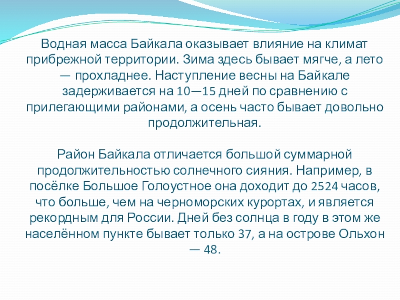 Слайд 7Водная масса Байкала оказывает влияние на климат прибрежной территории. Зима здесь