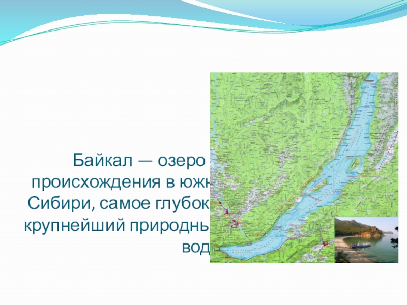 Слайд 2Байкал — озеро тектонического происхождения в южной части Восточной Сибири, самое