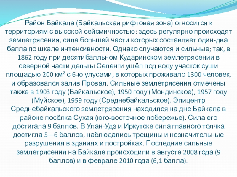 Слайд 15Район Байкала (Байкальская рифтовая зона) относится к территориям с высокой сейсмичностью:
