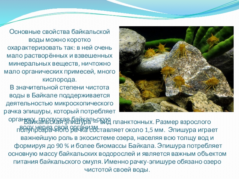 Слайд 10Байкальская эпишура — вид планктонных. Размер взрослого полупрозрачного рачка составляет около