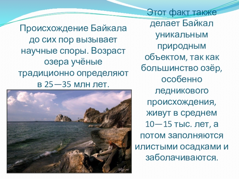 Происхождение Байкала до сих пор вызывает научные споры. Возраст озера учёные традиционно определяют в 25—35 млн лет.