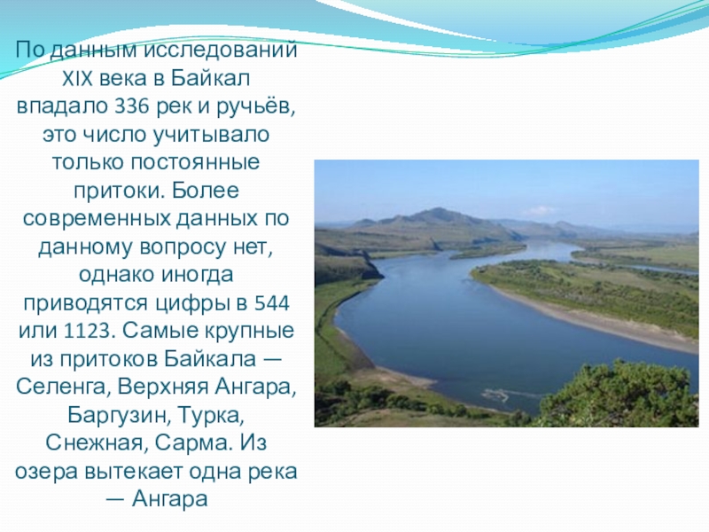 Слайд 9По данным исследований XIX века в Байкал впадало 336 рек и