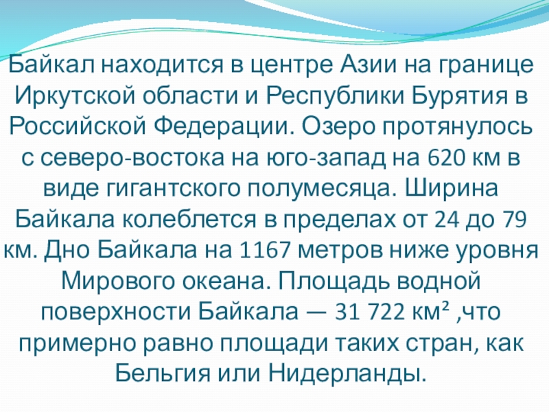Бурятия в Российской Федерации. Озеро протянулось с северо-востока на юго-запад на 620 км в виде гигантского полумесяца. Ширина Байкала колеблется в пределах от 24 до 79 км. Дно Байкала на 1167 метров ниже уровня Мирового океана. Площадь водной поверхности Байкала — 31 722 км² ,что примерно равно площади таких стран, как Бельгия или Нидерланды.