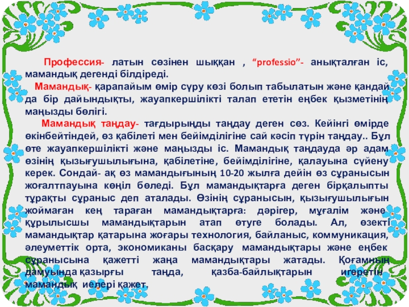 Профессия- латын сөзінен шыққан , “professio”- анықталған іс, мамандық дегенді білдіреді.    Мамандық- қарапайым өмір сүру көзі
