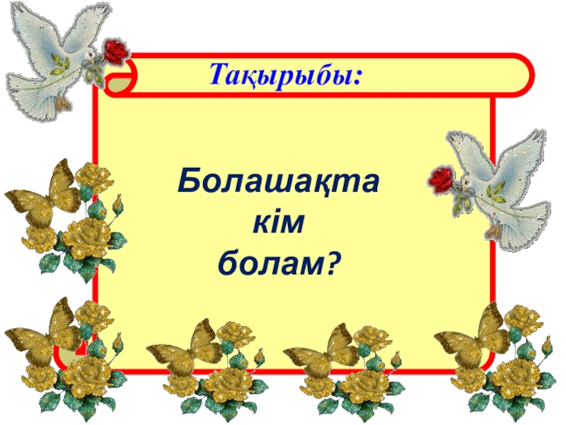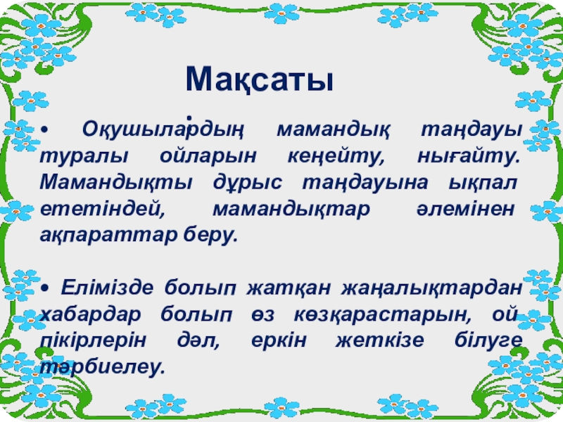 Мақсаты:  • Оқушылардың мамандық таңдауы туралы ойларын кеңейту, нығайту. Мамандықты дұрыс таңдауына ықпал ететіндей, мамандықтар әлемінен