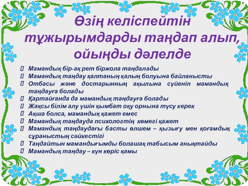 Өзің келіспейтін тұжырымдарды таңдап алып, ойыңды дәлелде Мамандық бір-ақ рет біржола таңдаладыМамандық таңдау қалтаның қалың болуына байланыстыОтбасы