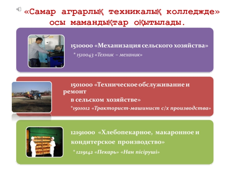 Слайд 9 «Самар аграрлық техникалық колледжде» осы мамандықтар оқытылады.