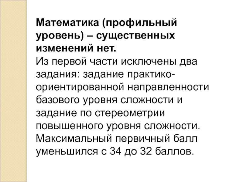 Слайд 12Математика (профильный уровень) – существенных изменений нет.