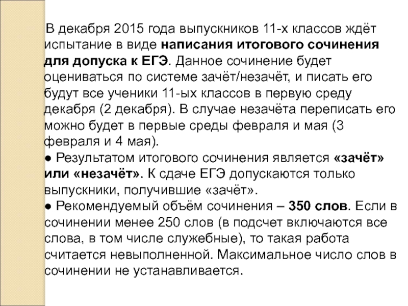 ● Результатом итогового сочинения является «зачёт» или «незачёт». К сдаче ЕГЭ допускаются только выпускники, получившие «зачёт».