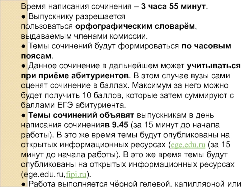 Слайд 15Время написания сочинения – 3 часа 55 минут.