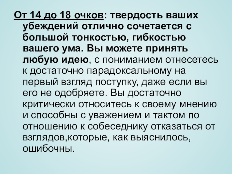 Слайд 6От 14 до 18 очков: твердость ваших убеждений отлично сочетается с