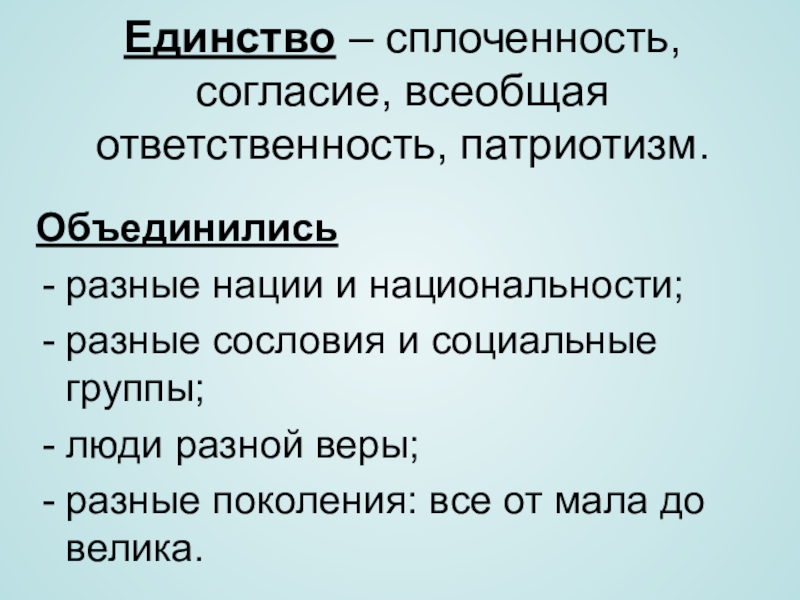 Слайд 12Единство – сплоченность, согласие, всеобщая ответственность, патриотизм.