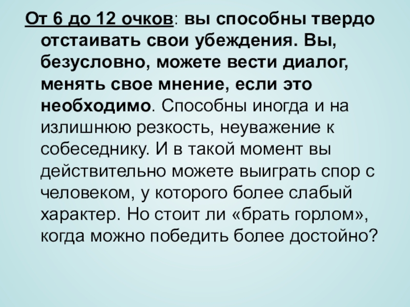 Слайд 5От 6 до 12 очков: вы способны твердо отстаивать свои убеждения.