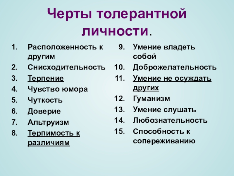 Слайд 3Черты толерантной личности.