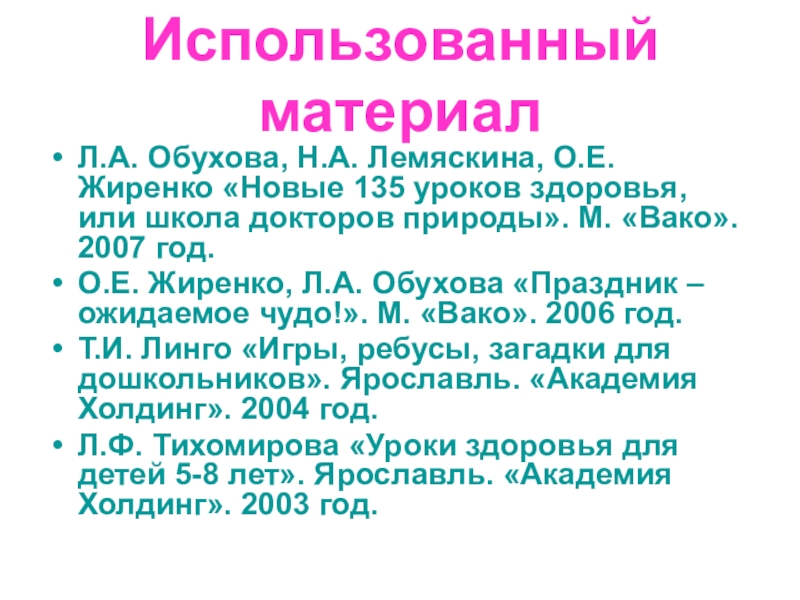 Л.Ф. Тихомирова «Уроки здоровья для детей 5-8 лет». Ярославль. «Академия Холдинг». 2003 год.