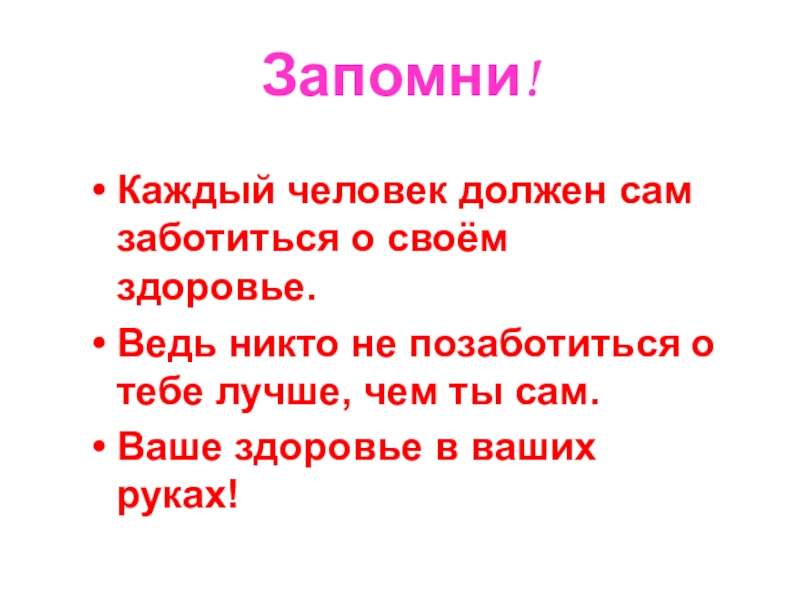 Каждый человек должен сам заботиться о своём здоровье.