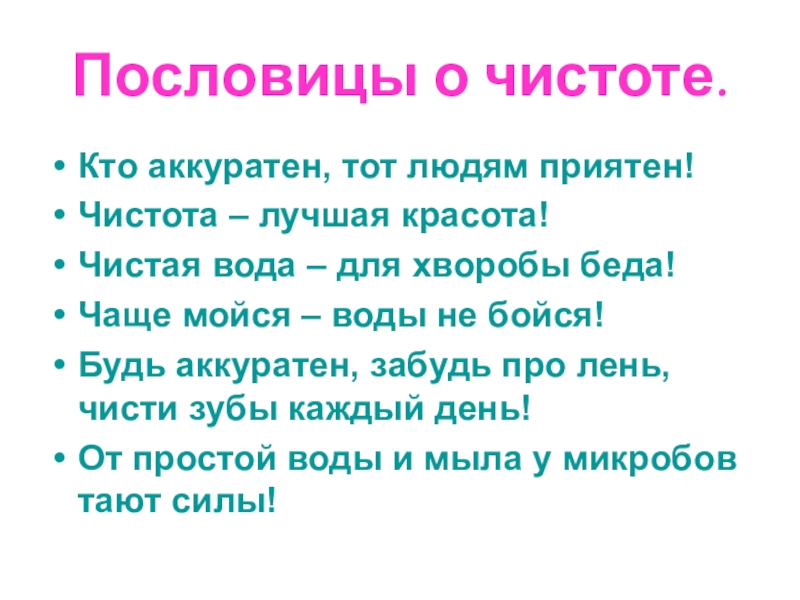 Слайд 5Пословицы о чистоте.
