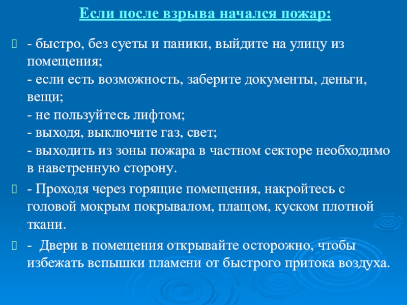 - Двери в помещения открывайте осторожно, чтобы избежать вспышки пламени от быстрого притока воздуха.