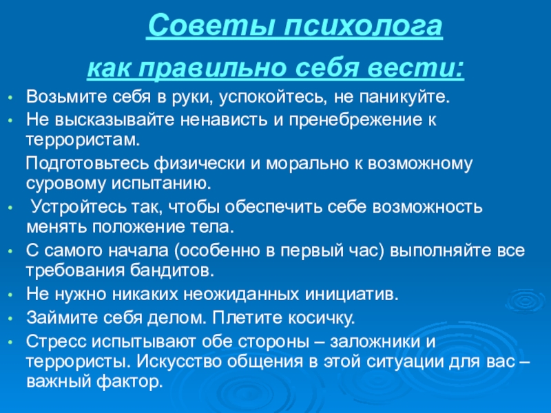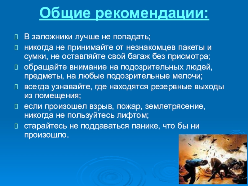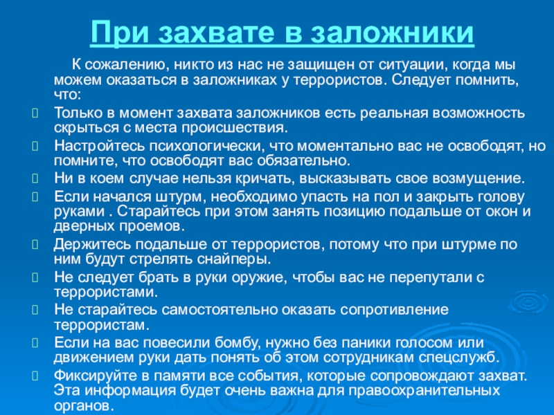 из нас не защищен от ситуации, когда мы можем оказаться в заложниках у террористов. Следует помнить, что: