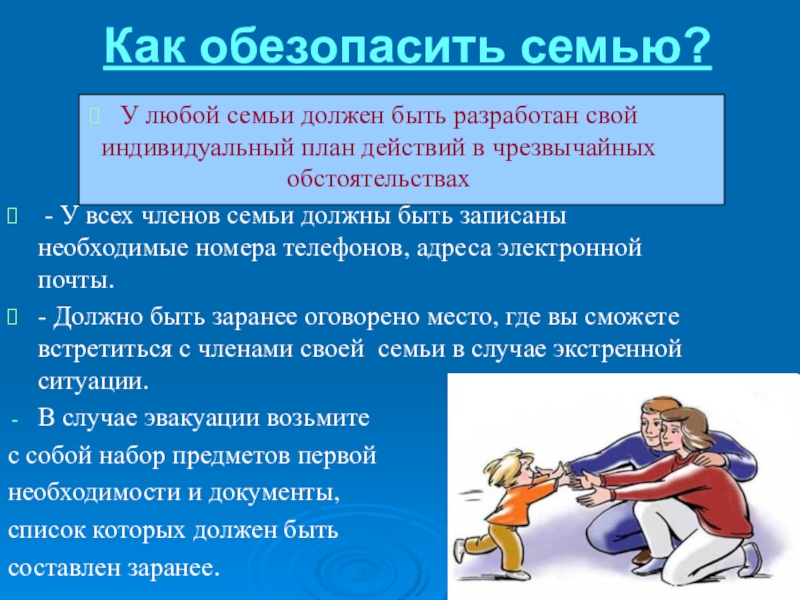 - Должно быть заранее оговорено место, где вы сможете встретиться с членами своей семьи в случае экстренной ситуации.