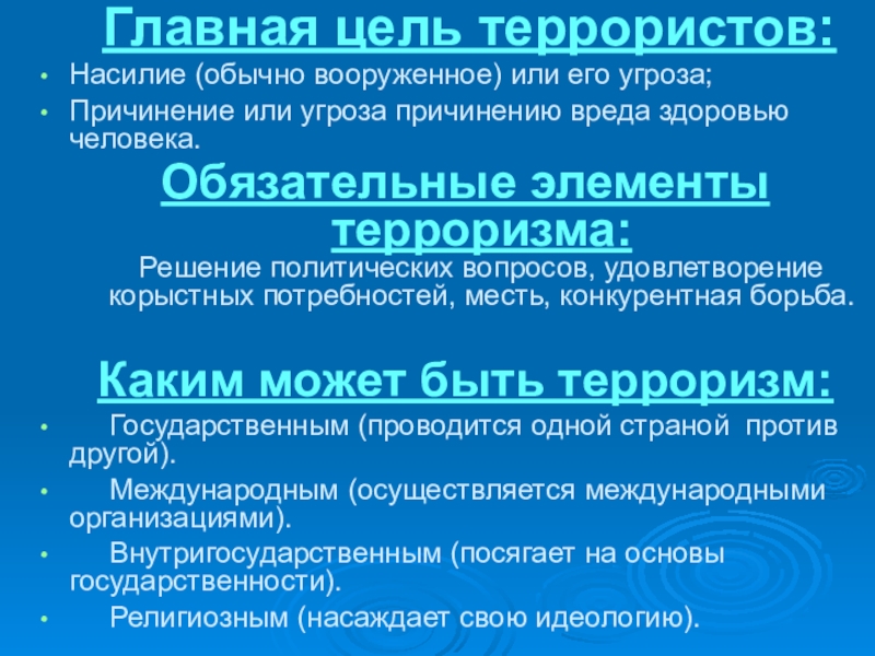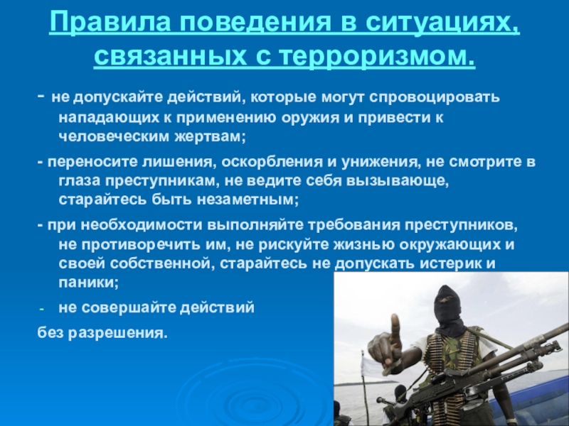 Не старайтесь самостоятельно оказать сопротивление террористам.