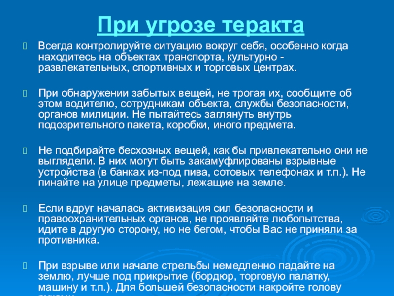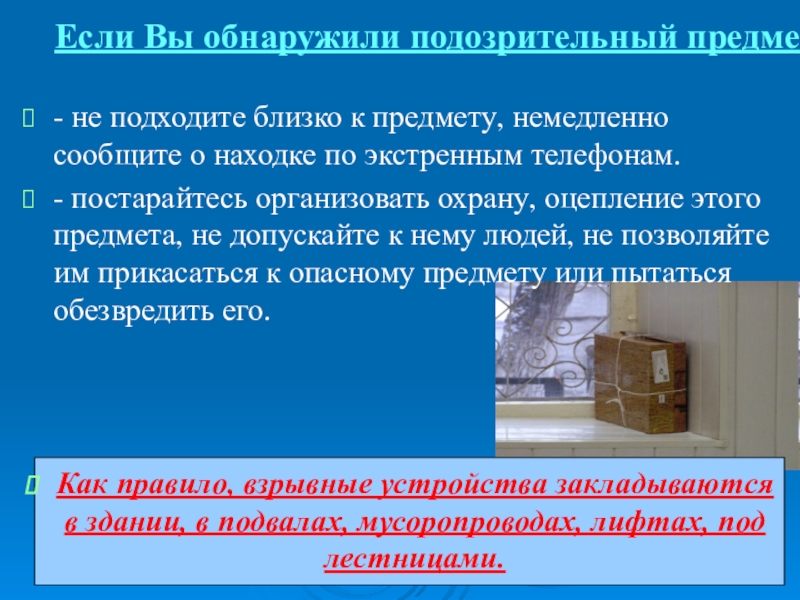 При обнаружении забытых вещей, не трогая их, сообщите об этом водителю, сотрудникам объекта, службы безопасности, органов милиции. Не пытайтесь заглянуть внутрь подозрительного пакета, коробки, иного предмета.