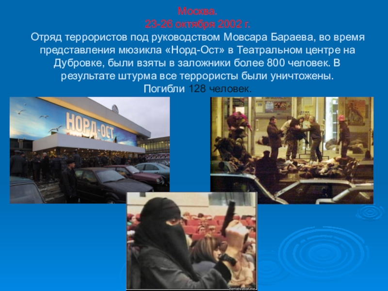 представления мюзикла «Норд-Ост» в Театральном центре на Дубровке, были взяты в заложники более 800 человек. В результате штурма все террористы были уничтожены.