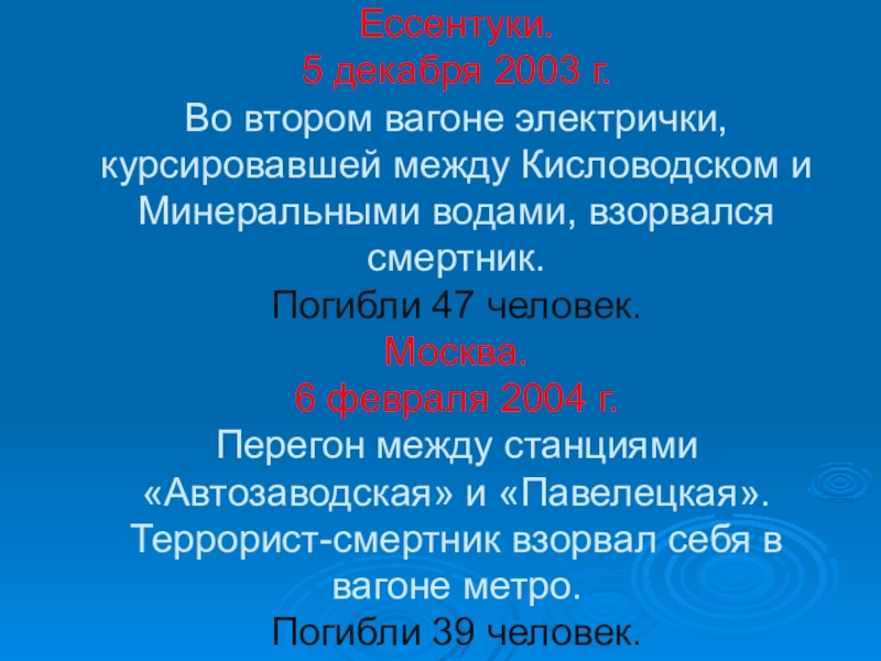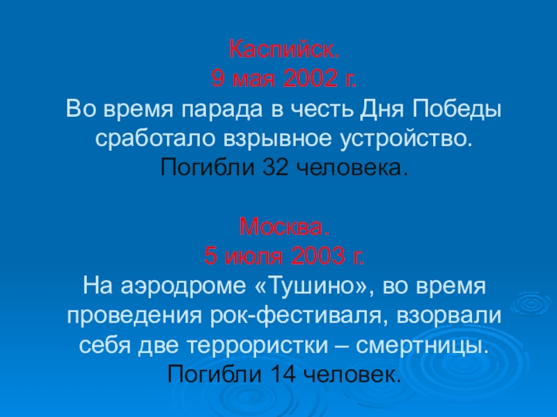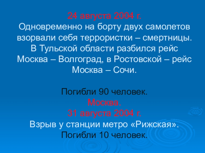 На аэродроме «Тушино», во время проведения рок-фестиваля, взорвали себя две террористки – смертницы.