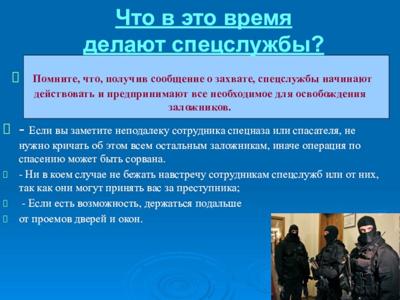захвате, спецслужбы начинают действовать и предпринимают все необходимое для освобождения заложников.
