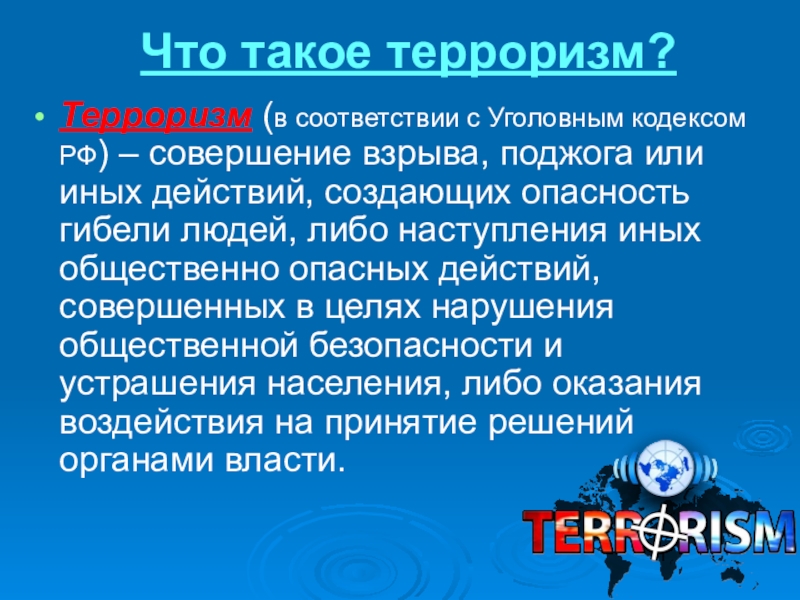 Терроризм (в соответствии с Уголовным кодексом РФ) – совершение