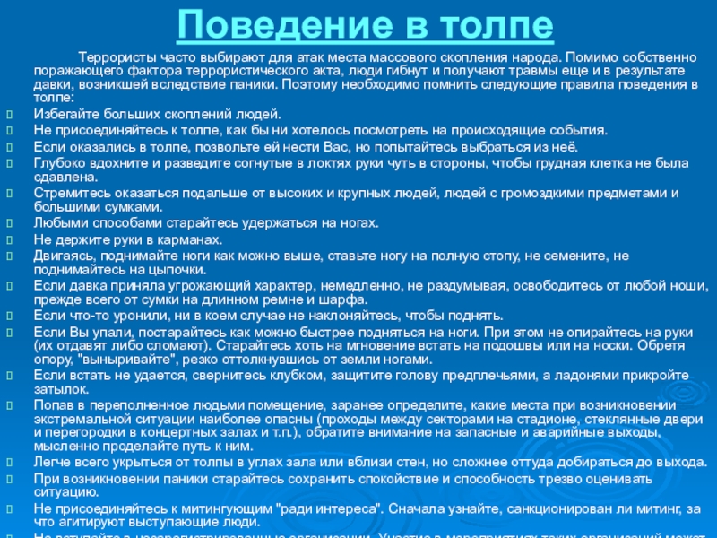 Помимо собственно поражающего фактора террористического акта, люди гибнут и получают травмы еще и в результате давки, возникшей вследствие паники. Поэтому необходимо помнить следующие правила поведения в толпе: