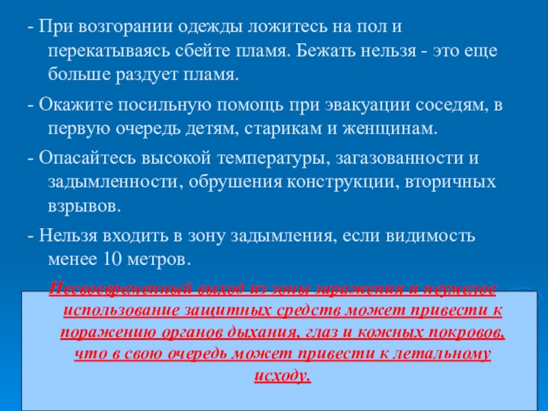 - При возгорании одежды ложитесь на пол и перекатываясь сбейте пламя.
