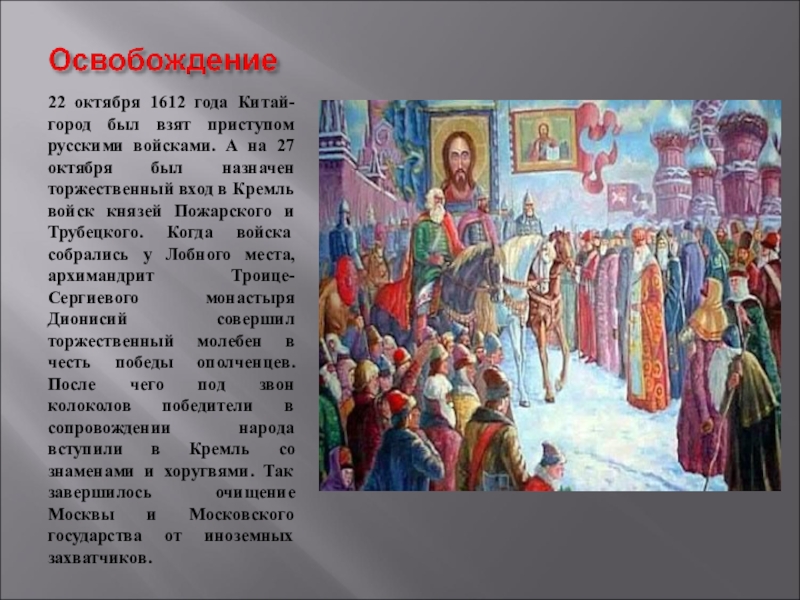 на 27 октября был назначен торжественный вход в Кремль войск князей Пожарского и Трубецкого. Когда войска собрались у Лобного места, архимандрит Троице-Сергиевого монастыря Дионисий совершил торжественный молебен в честь победы ополченцев. После чего под звон колоколов победители в сопровождении народа вступили в Кремль со знаменами и хоругвями. Так завершилось очищение Москвы и Московского государства от иноземных захватчиков.