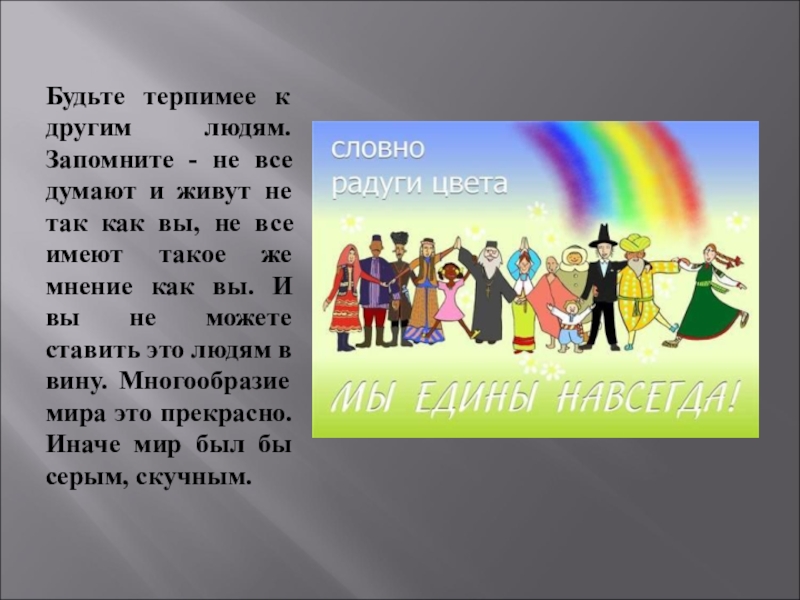 Слайд 16Будьте терпимее к другим людям. Запомните - не все думают и