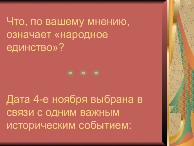 Что, по вашему мнению, означает «народное единство»?    Дата 4-е ноября выбрана в связи с