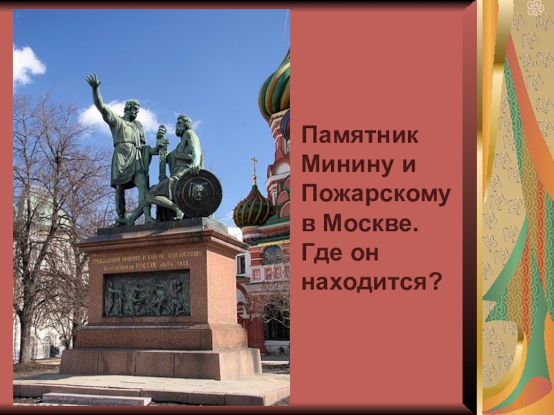 Слайд 4Памятник Минину и Пожарскому в Москве. Где он находится?