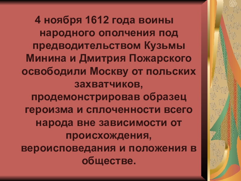 Что, по вашему мнению, означает «народное единство»? Дата 4-е ноября выбрана в связи с одним важным историческим событием: