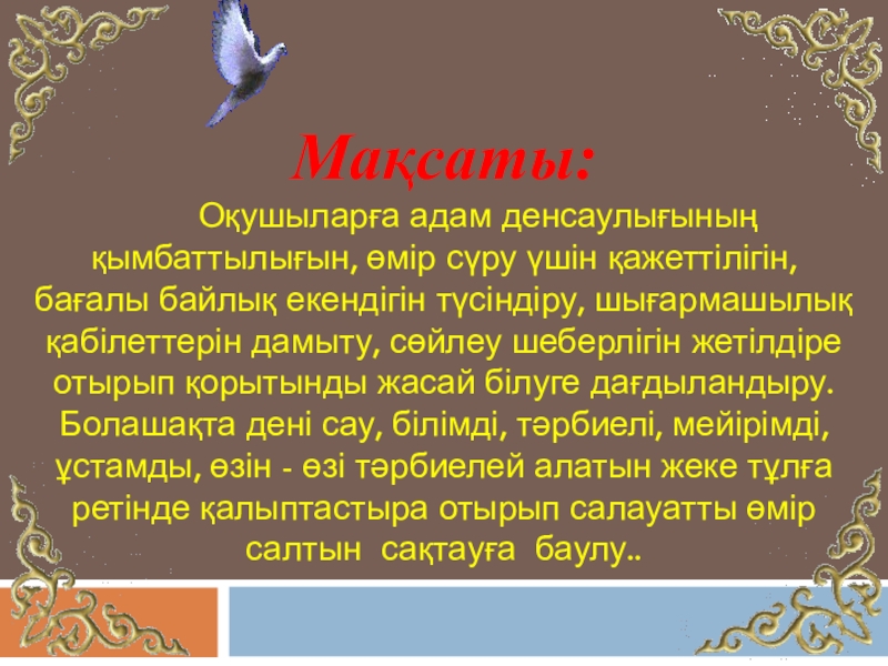 Слайд 2Мақсаты: Оқушыларға адам денсаулығының қымбаттылығын, өмір сүру