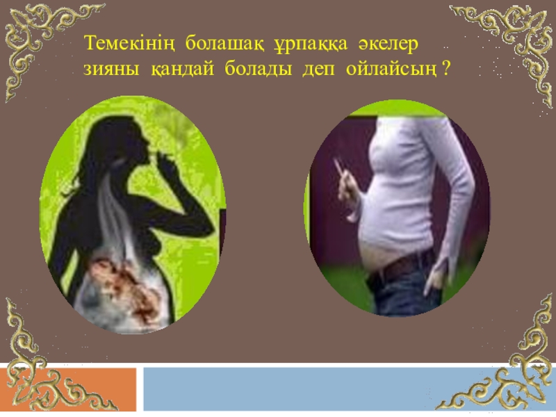 Слайд 6Темекінің болашақ ұрпаққа әкелер зияны қандай болады деп ойлайсың ?