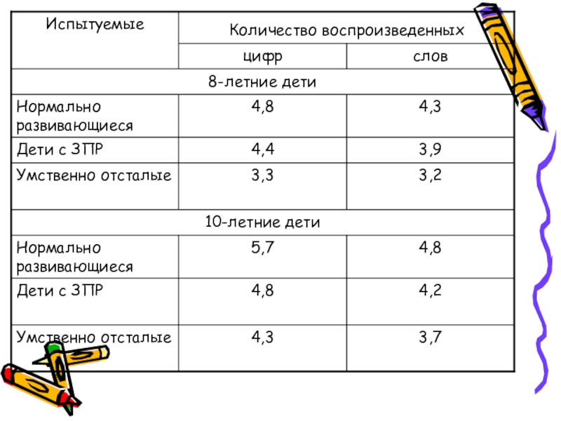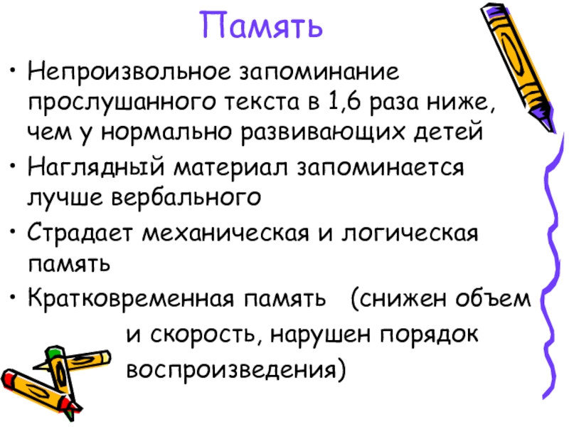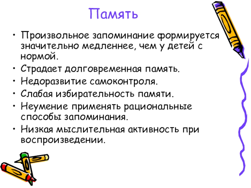 Произвольное запоминание формируется значительно медленнее, чем у детей с нормой.