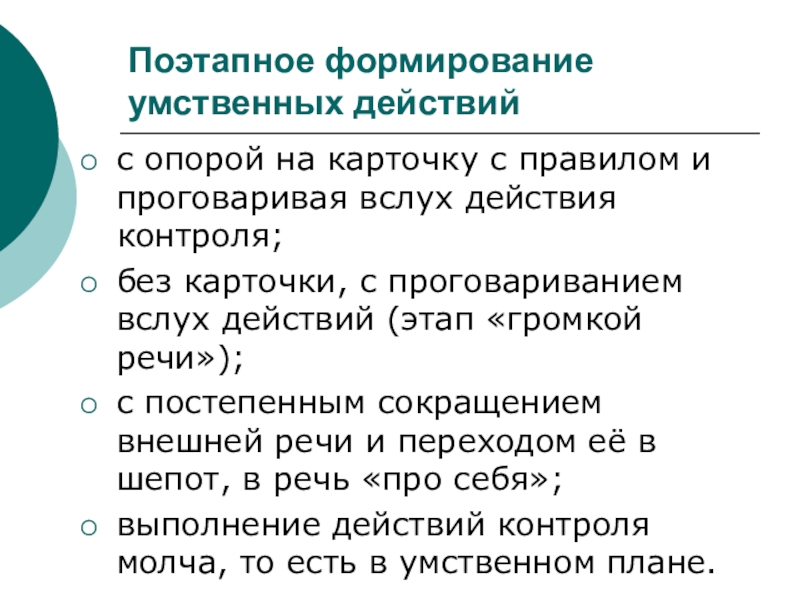 без карточки, с проговариванием вслух действий (этап «громкой речи»);