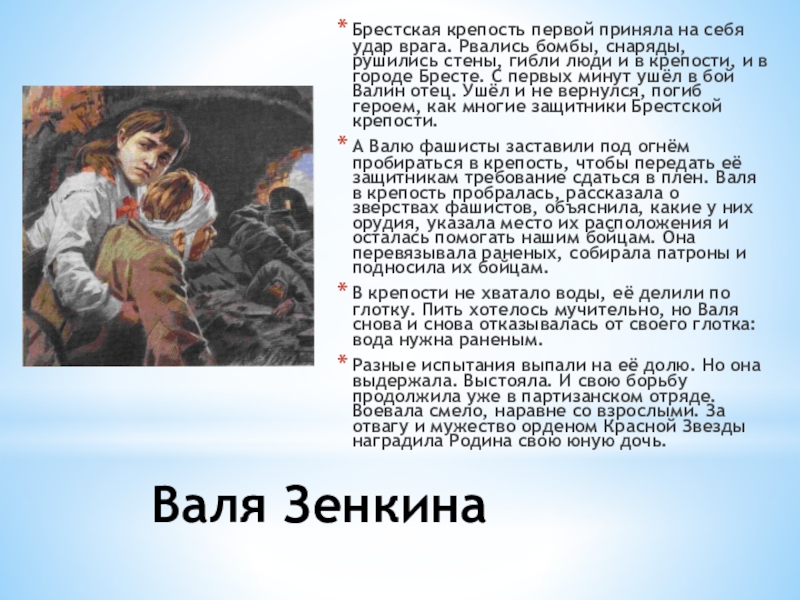 А Валю фашисты заставили под огнём пробираться в крепость, чтобы передать её защитникам требование сдаться в плен. Валя в крепость пробралась, рассказала о зверствах фашистов, объяснила, какие у них орудия, указала место их расположения и осталась помогать нашим бойцам. Она перевязывала раненых, собирала патроны и подносила их бойцам.