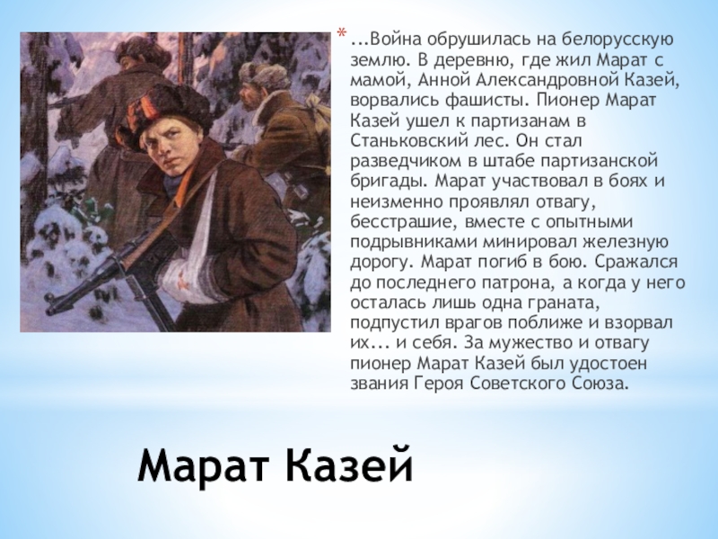 с мамой, Анной Александровной Казей, ворвались фашисты. Пионер Марат Казей ушел к партизанам в Станьковский лес. Он стал разведчиком в штабе партизанской бригады. Марат участвовал в боях и неизменно проявлял отвагу, бесстрашие, вместе с опытными подрывниками минировал железную дорогу. Марат погиб в бою. Сражался до последнего патрона, а когда у него осталась лишь одна граната, подпустил врагов поближе и взорвал их... и себя. За мужество и отвагу пионер Марат Казей был удостоен звания Героя Советского Союза.