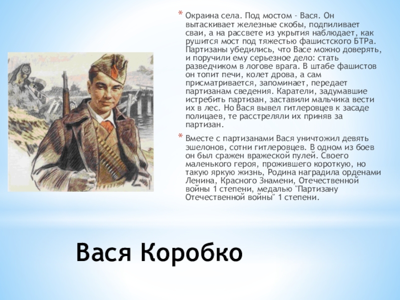 подпиливает сваи, а на рассвете из укрытия наблюдает, как рушится мост под тяжестью фашистского БТРа. Партизаны убедились, что Васе можно доверять, и поручили ему серьезное дело: стать разведчиком в логове врага. В штабе фашистов он топит печи, колет дрова, а сам присматривается, запоминает, передает партизанам сведения. Каратели, задумавшие истребить партизан, заставили мальчика вести их в лес. Но Вася вывел гитлеровцев к засаде полицаев, те расстреляли их приняв за партизан.